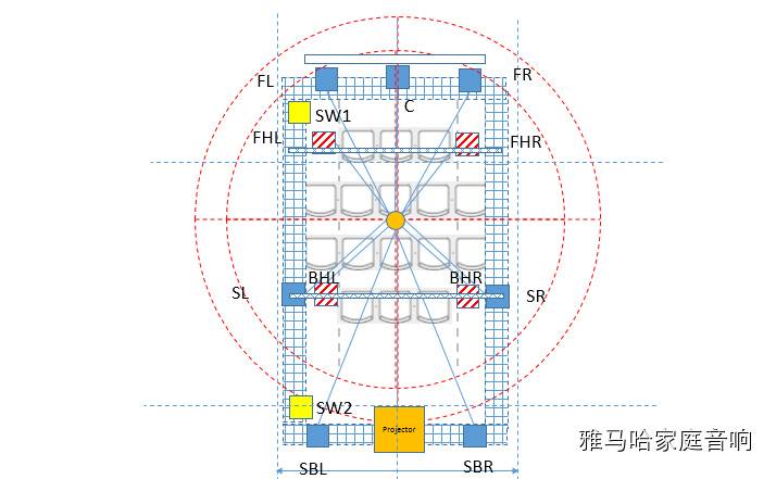 此次展會雅馬哈新全景聲功放RX-A3040次在國內試音,所以雅馬哈公司在設置上面完全按照的家庭全景聲要求,7.2.4聲道的布置。現場由于空間有限,雅馬哈采用了桁架的方式,搭建了一個“內骨骼”,以便在不影響美觀的情況下,順利的把8只音箱,包括4只天花音箱,4只環繞音箱固定下來。