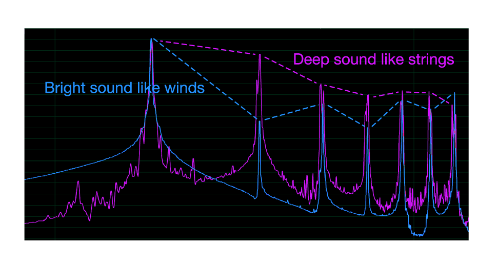 樂器的音色是由基本頻率及其整數倍頻率(=倍音)組成。加速音也類似,通過設計倍音成分,從管樂器清晰的聲音到弦樂器有力的聲音都可廣泛地表現。