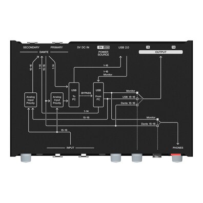 當 USB 通信因 PC 狀態或 USB 連接狀態而中斷時,BYPASS USB 激活。它最大限度地減少了 USB 通信中斷時發生的音頻丟失的影響。例如,如果來自 PC 的音頻信號異常,如果 Dante 采樣率改變,或者如果與 PC 的 USB 連接中斷,模式將切換到旁通。